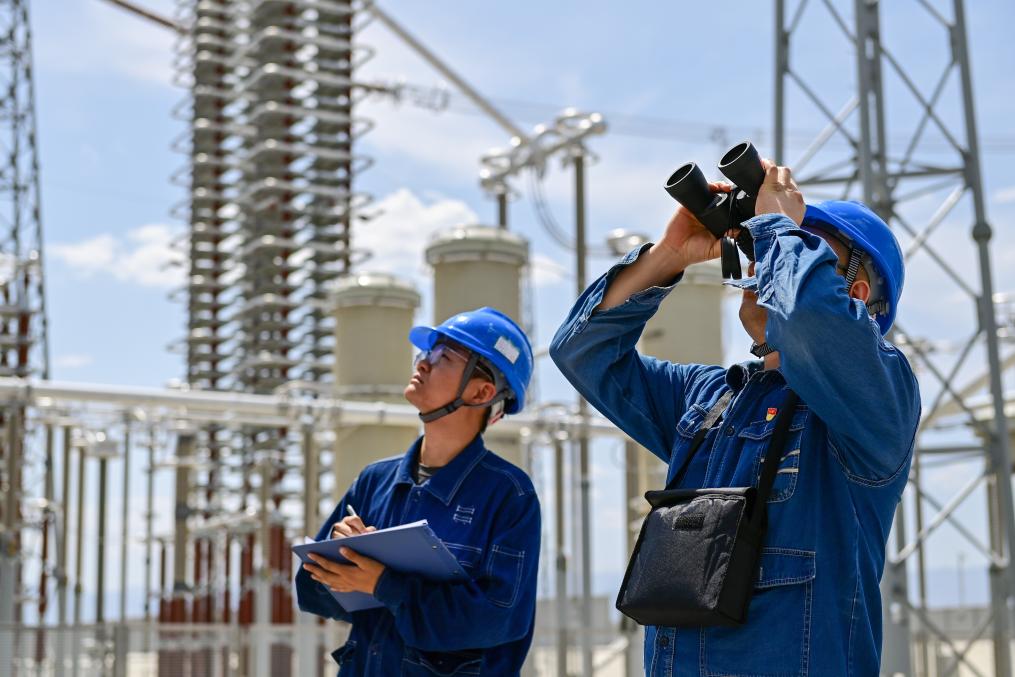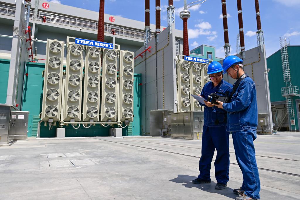 6月10日,在哈密—重庆±800千伏特高压直流输电工程新疆送端站——巴里坤换流站,运检人员在换流变区域进行红外检测工作。