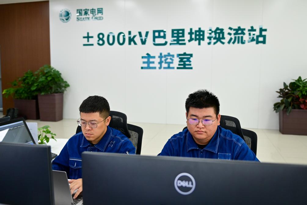 在哈密—重庆±800千伏特高压直流输电工程新疆送端站——巴里坤换流站,运检人员在主控室监看运行数据(6月10日摄)。