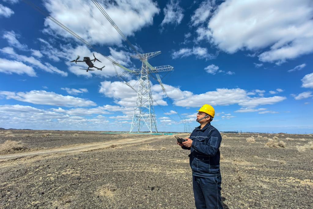 在新疆哈密市,电力员工操纵无人机对哈密—重庆±800千伏特高压直流输电工程进行验收(4月3日摄)。