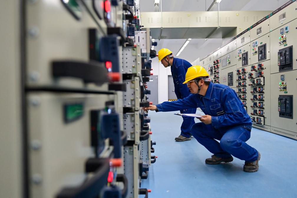6月10日,在哈密—重庆±800千伏特高压直流输电工程新疆送端站——巴里坤换流站,运检人员在配电室进行巡检工作。