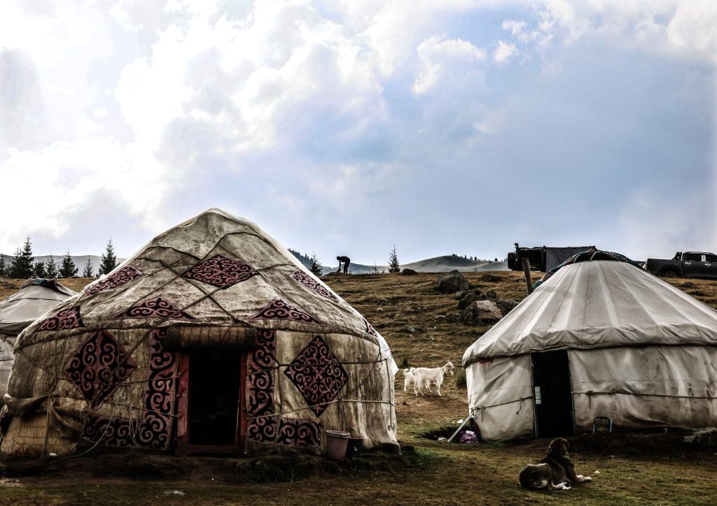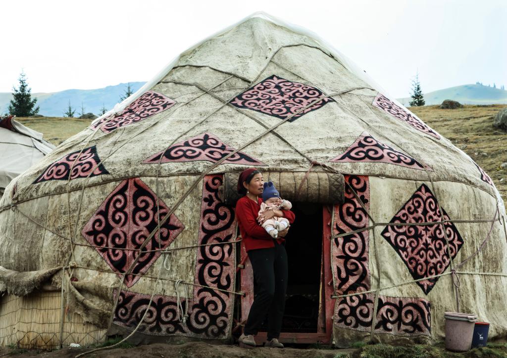 7月29日,一位牧民抱着孩子在毡房门口张望。