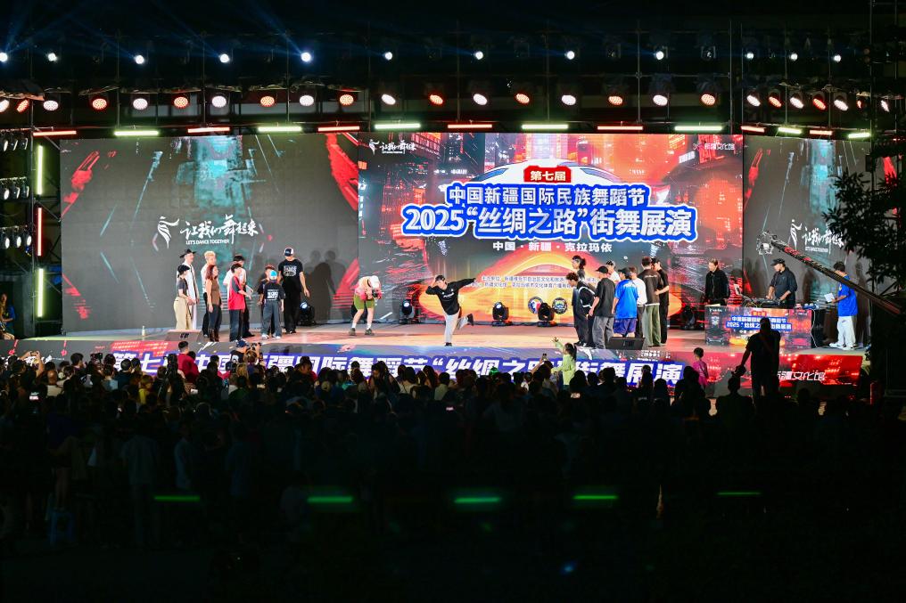 8月3日,中外舞者在2025“丝绸之路”街舞展演活动中进行斗舞展示。