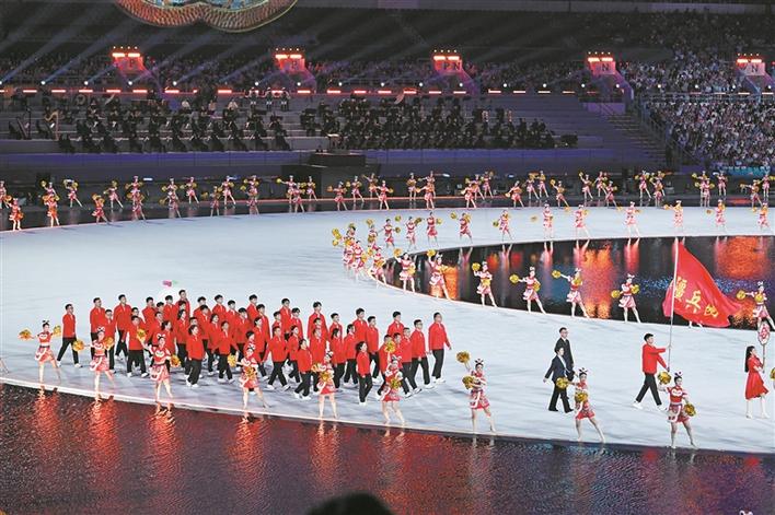 “现在向我们走来的是新疆生产建设兵团体育代表团。他们传承红色基因、赓续红色血脉、扎根祖国边疆,在建设美丽新疆、繁荣兵团的伟大实践中书写新时代体育篇章!”伴随着解说词,兵团体育代表团成员步伐铿锵,进入开幕式现场。