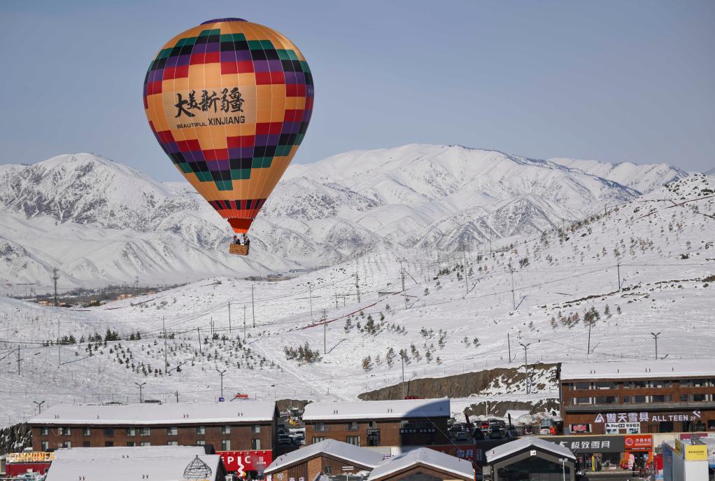 这是游客在新疆阿勒泰将军山国际滑雪度假区乘坐热气球赏雪景(1月25日摄)。新华社记者 胡虎虎 摄